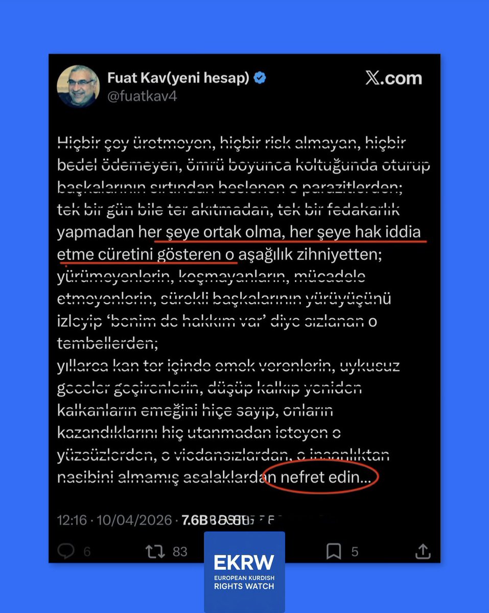 Kürt karşıtı PKK/KCK suç örgütü Avrupa sorumlularından Fuat Kav, PKK'ya katılmayan Kürtlere karşı nefret çağrısı yaptı. İstihbarat örgütleri ve ülkücülerle her türlü ilişkiye giren PKK/KCK, kırk yıldır Kürtler içerisinde nefret körüklemek ve iç çatışma üretmekle biliniyor.