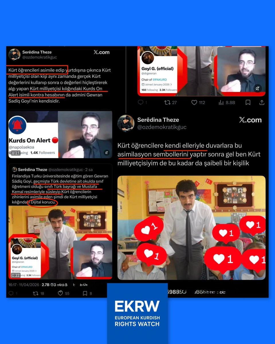 PKK dijital tetikçi tim sorumlusu Kadri Karadeniz'in yönettiği trol bir hesaptan, Finlandiya'da yaşayan PAKURD genel başkanı Gewran GOYÎ hedef gösterildi. Suç örgütü bir yandan Kürtlere Türkiyelileşmeyi silahla dayatırken, öte yandan Türkiyeci yaftasıyla dezenformasyon yayıyor.