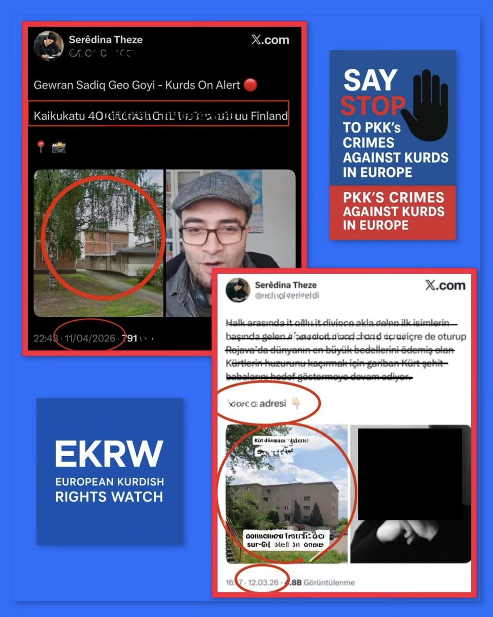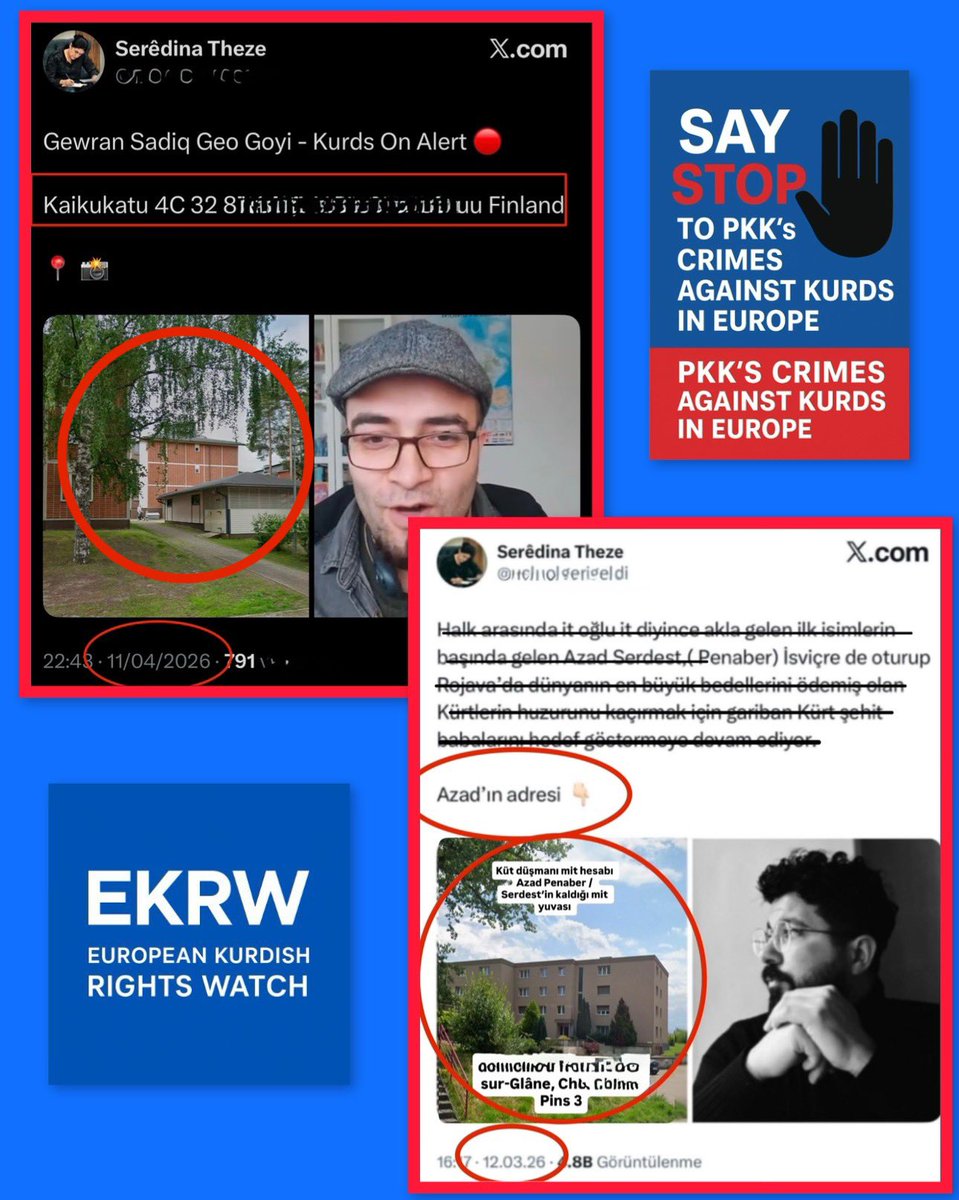 14 Mart 2026 - İsviçre Cenevre'de yaşayan Macîd Soreyî adlı kişi, PKK Avrupa çatı örgütü KCDK-E'yi etiketleyerek, 3 kişilik Cenevre PKK dernek yöneticileri tarafından partiye (pkk) düşmanlık iddiasıyla tehdit edildiğini yazdı. X kullanıcısı daha sonra yazdığı duyuruyu sildi.